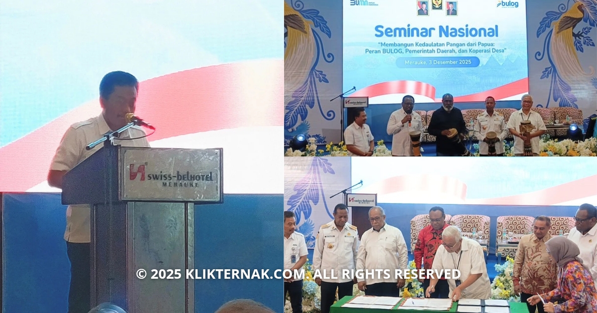 Merauke – Klik Ternak. Merauke memantapkan posisinya sebagai lumbung pangan nasional melalui Seminar Nasional dengan tema “Membangun Kedaulatan Pangan dari Papua: Peran BULOG, Pemerintah Daerah dan Koperasi Daerah dan Koperasi Desa” yang berlangsung di Swiss Bell, Rabu (03/11/2025).